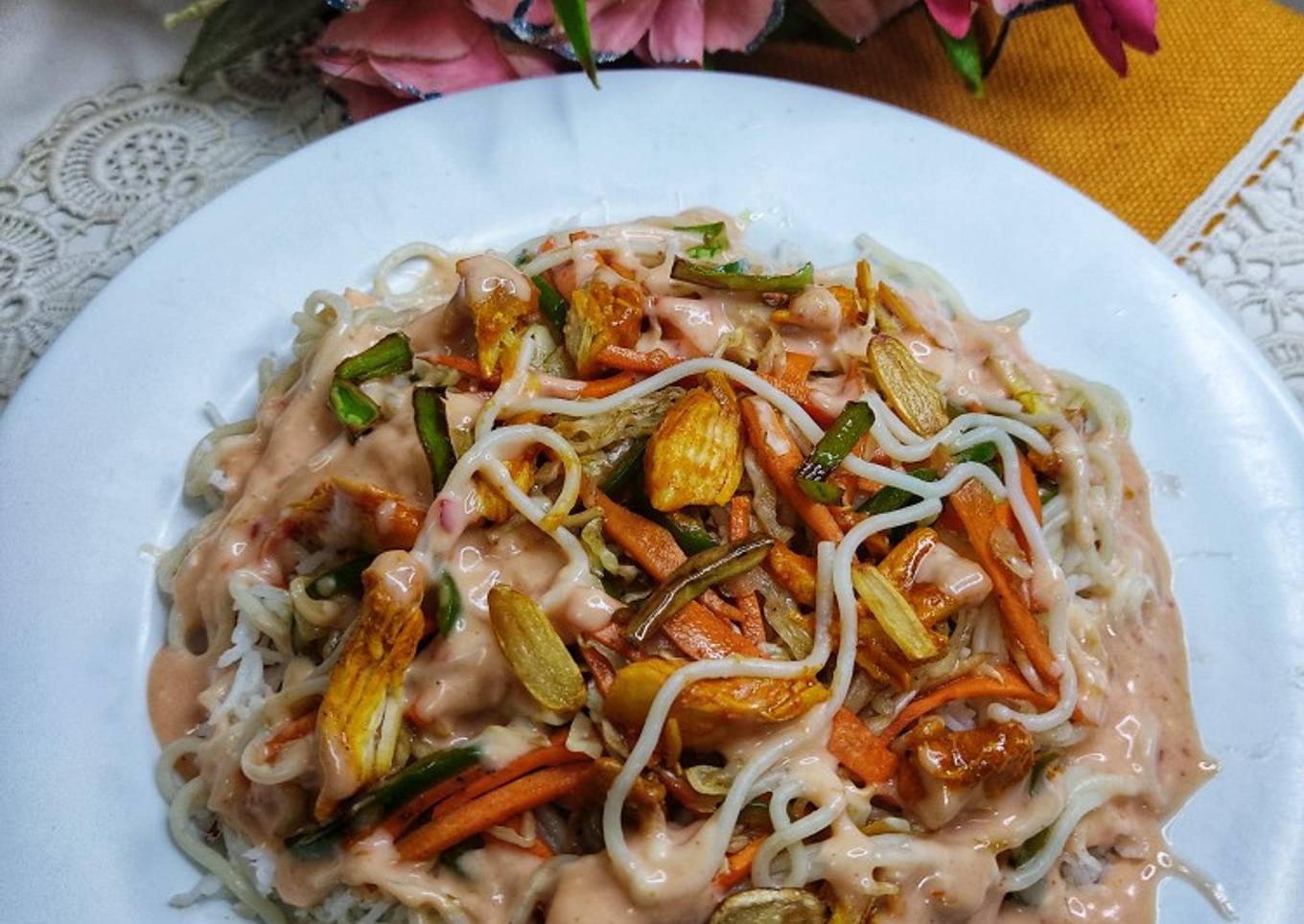 - Now start layering add layer of rice then fried veggies and spaghettis then add mayo garlic sauce and then heat oil add green chillies and garlic cloves and fry them and pour a tarka over rice and serve..