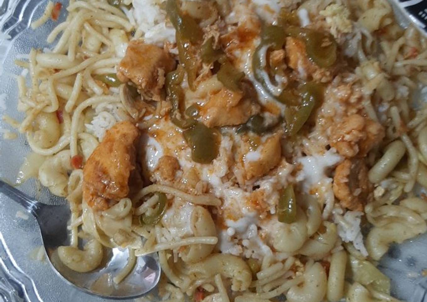 our the remaining rice over the mixture, spread the paste of cream, fried chilli and garlic over it.Now Sprinkle fried noodles over it. Delicious Delicious Singaporean Rice is ready to serve.