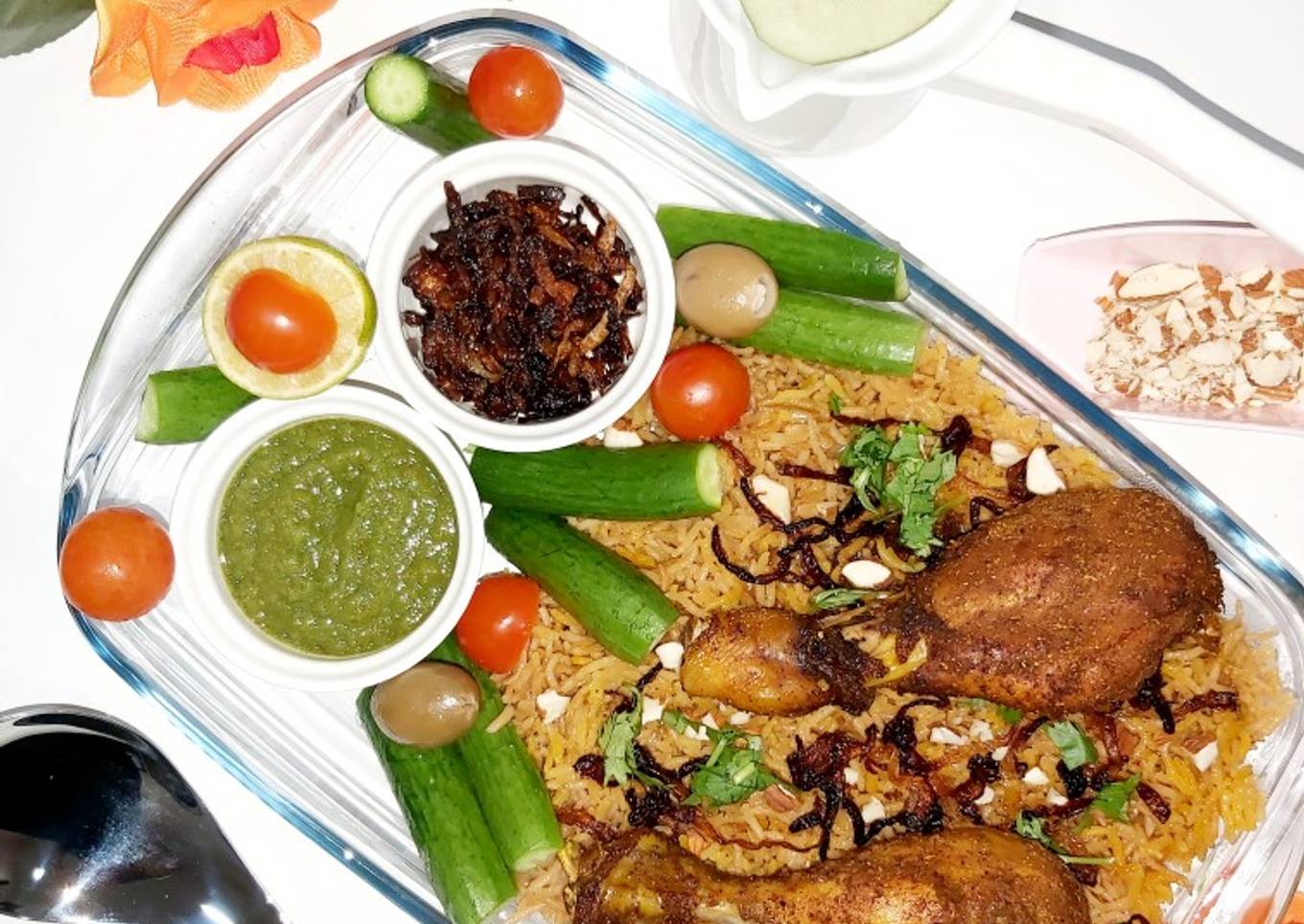 - Dish out the rice, garnish with almonds, pines, coriander and brown crispy onions, put chicken on it and serve with chutney.