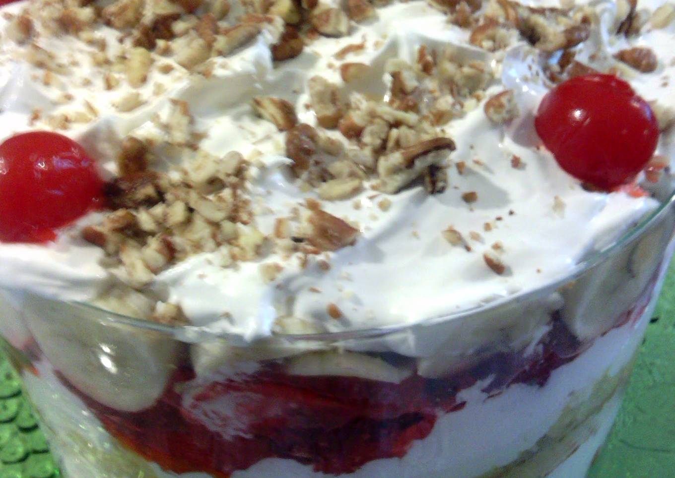 - place place one piece of cake on bottom, place strawberrys slices on top of cake, place half of jello on top of strawberrys, whip cream 1cup, add another cake ontop of whip cream. now add pineapples, jello, whip cream, cake, bananas slices , whip cream, peacans,maraschino cherries.