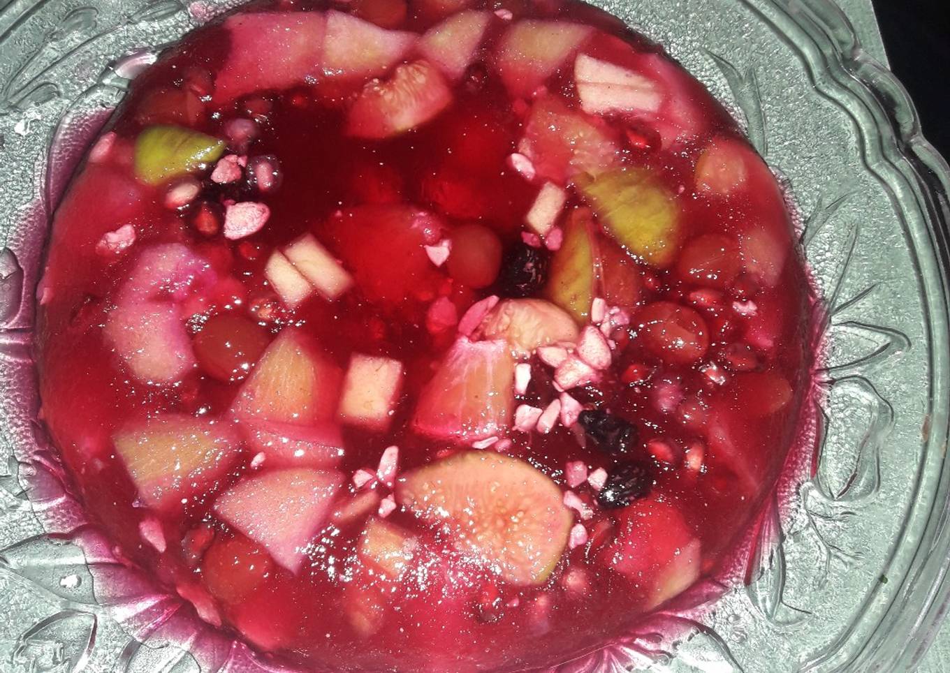 - At last place all fruits in a plate in which you have to set jelly. Then pour whole jelly mixture on fruits n keep in fridge for setting upto 45 min n then seve cool. All who eat vll get loved it.it taste so good n cool.