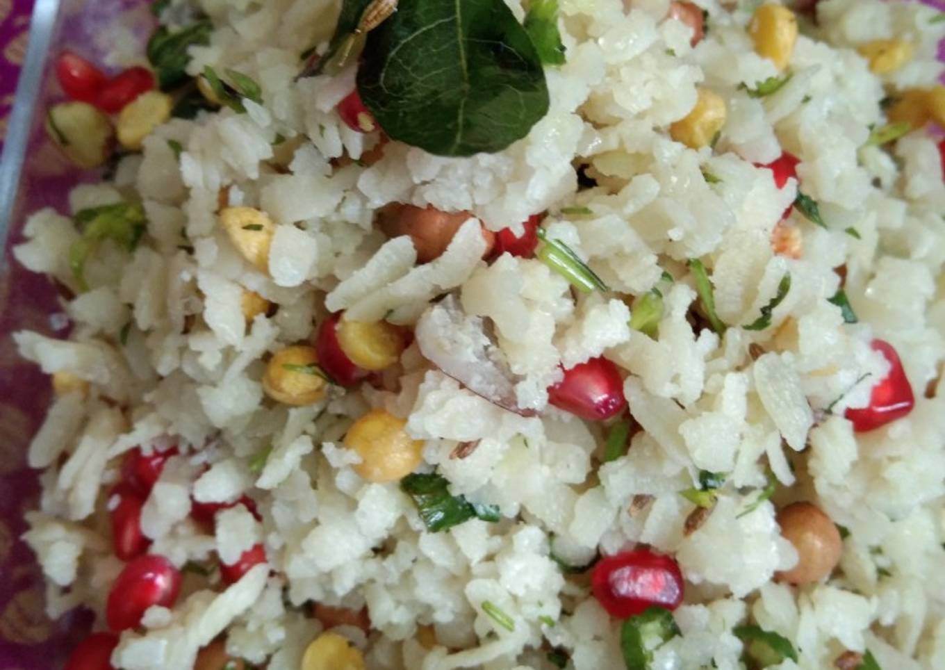 - Now add milk (should not hot) add youghurt salt and sugar.mix well now add cucumber, pomegranate coariander.heat tadaka pan add ghee to it then add chopped chillies, curry leaves, soaked chana dal and peanuts.pour this on flattened rice.